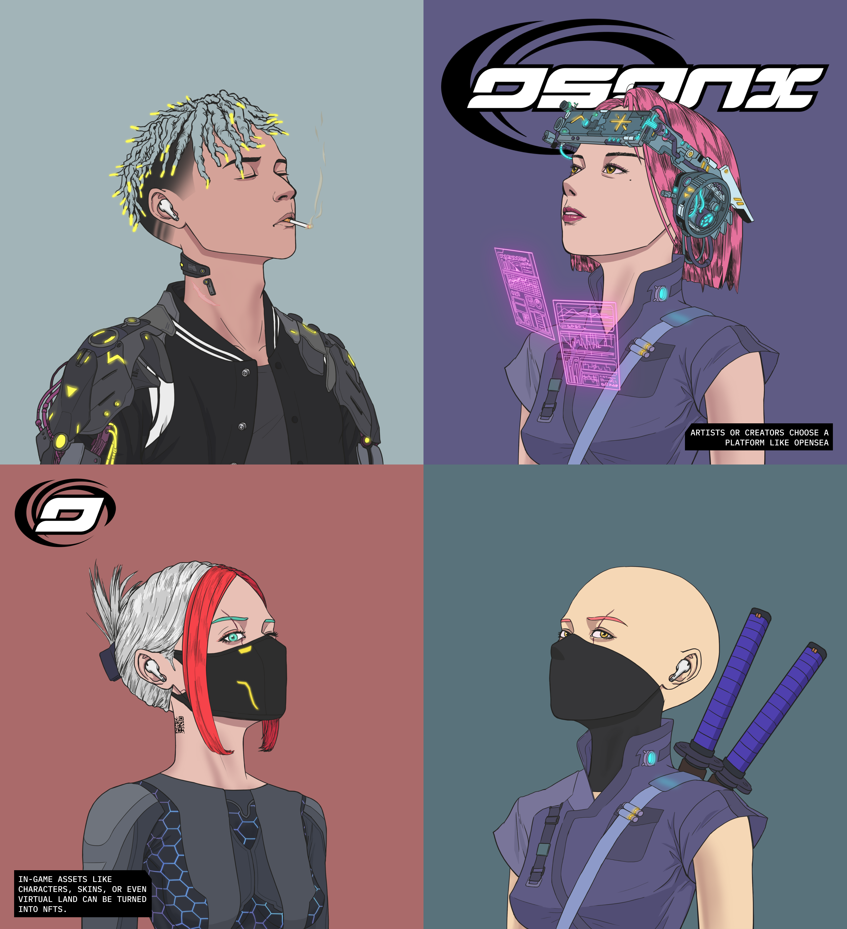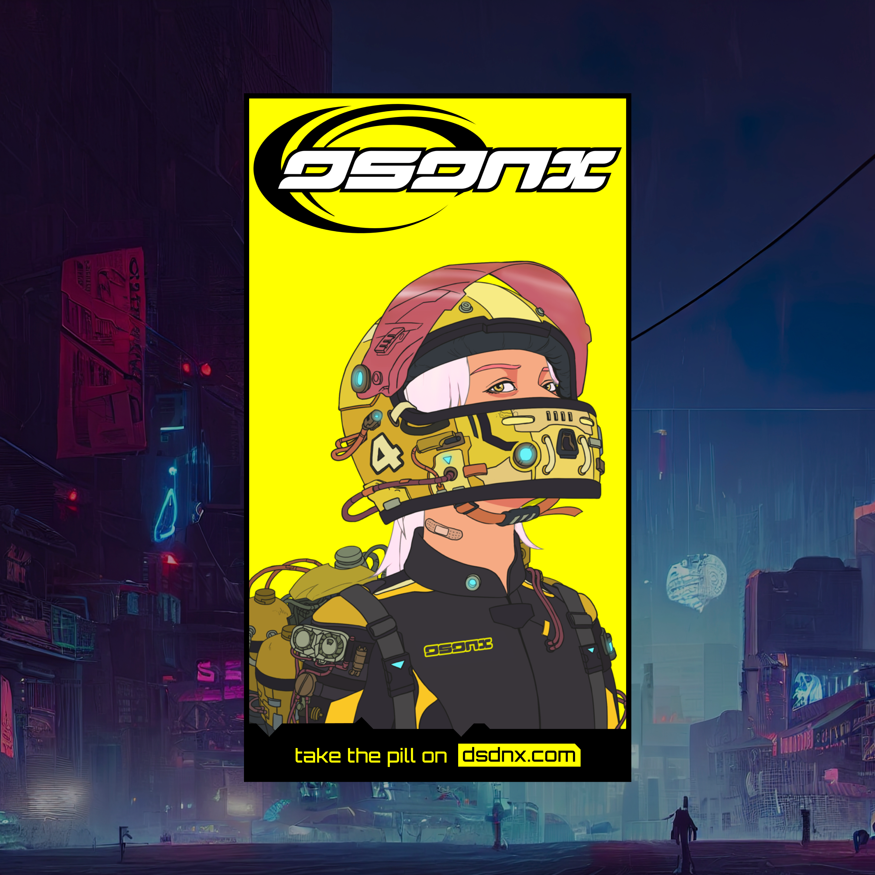 DSDNX — це Web 3.0 проєкт та колекція NFT з інноваційними підходами до членства та контенту. Дизайн логотипу, типографіка та загальний стиль проєкту натхненні естетикою кіберпанку, що надає їм футуристичного та технологічного вигляду.