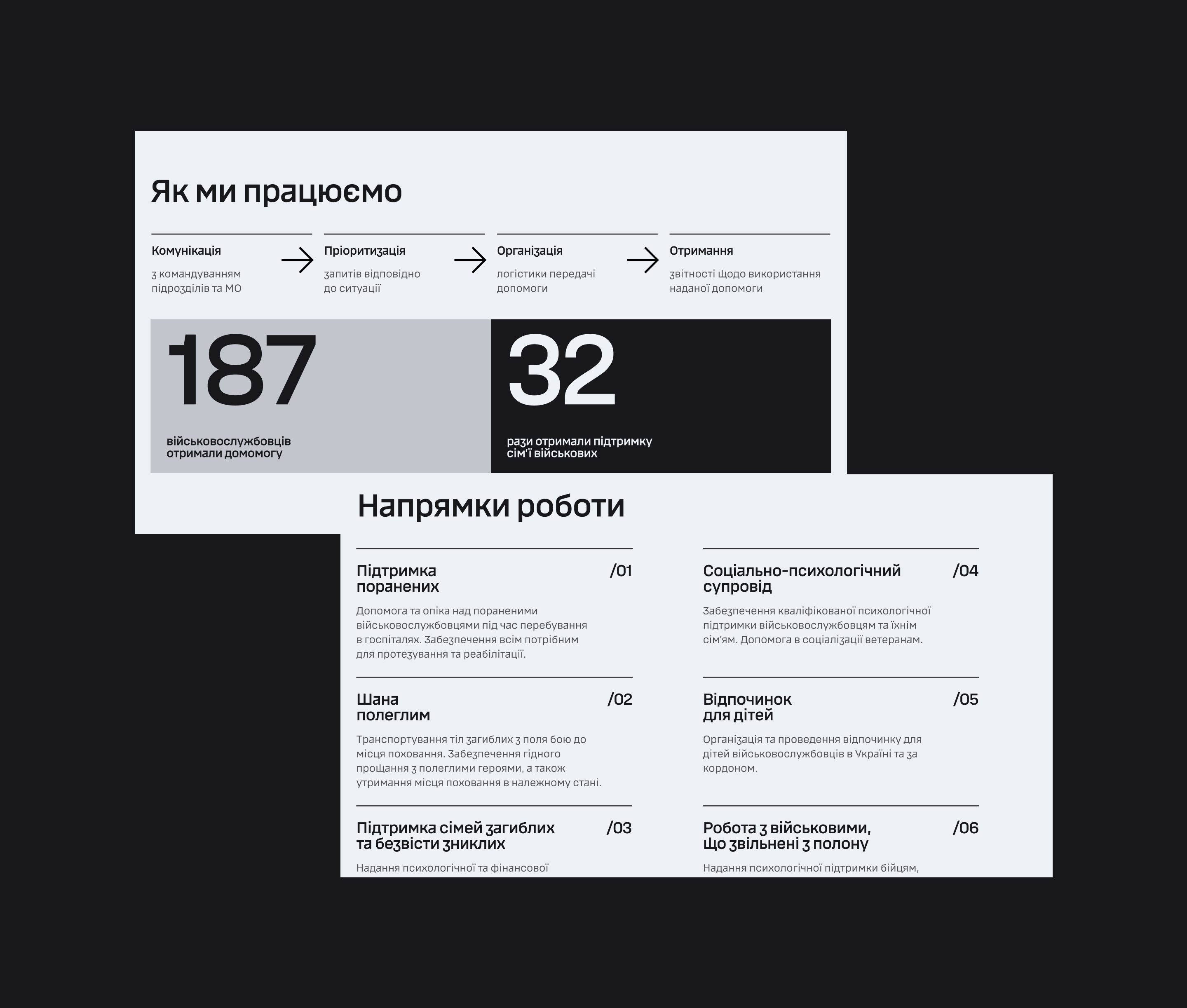 Ми створили сайт в усталеній для мілітарі-сектору вебестетиці: стриманий у колірній палітрі, прямолінійний, без зайвих прикрас.