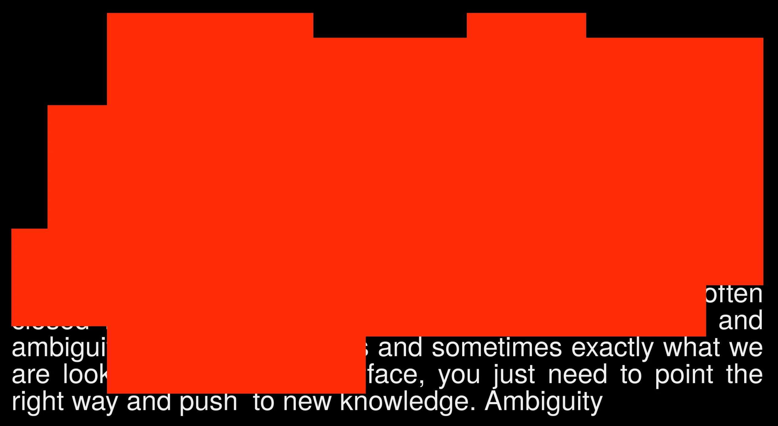 Ці складні фігури об’єднані зі швейцарською сіткою та гельветикою. У цій айдентиці втілені ходи які підкреслюють інформацію при чому приховуючи повну картину. Нам здалось що це вдала алегорія неоднозначності — абстракція, несказанність, але й натяк на те що є ідея яку варто осягнути.