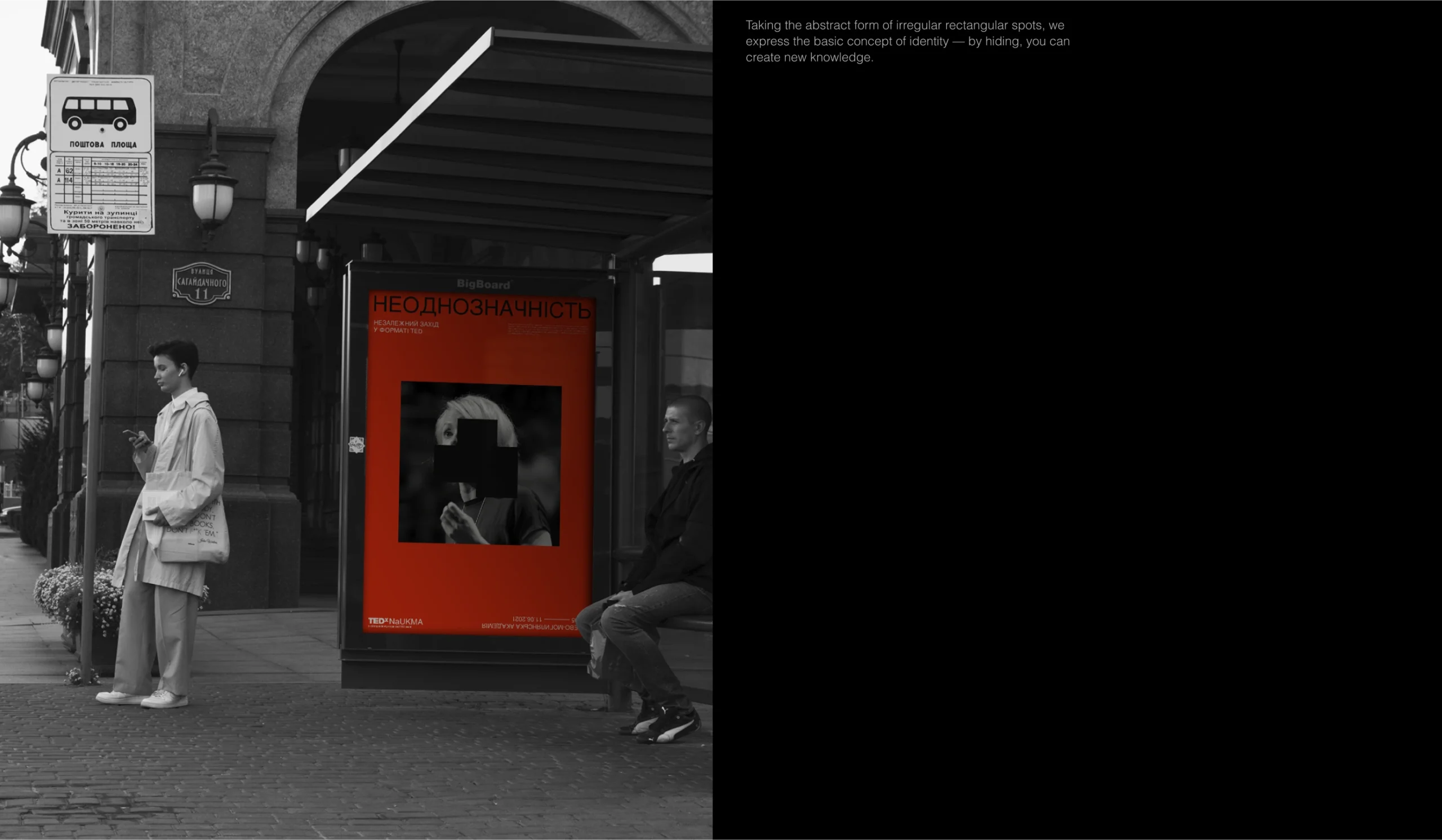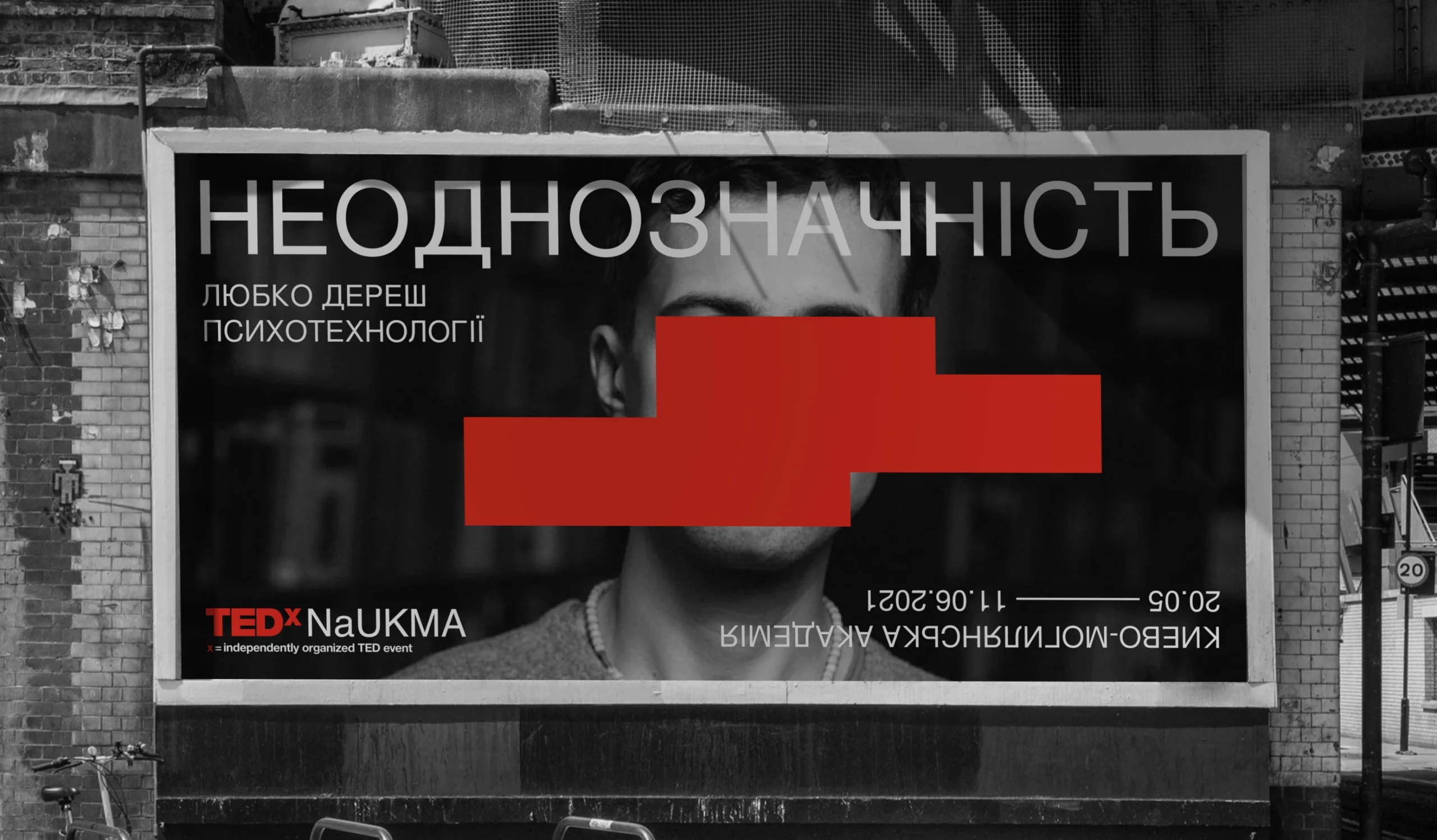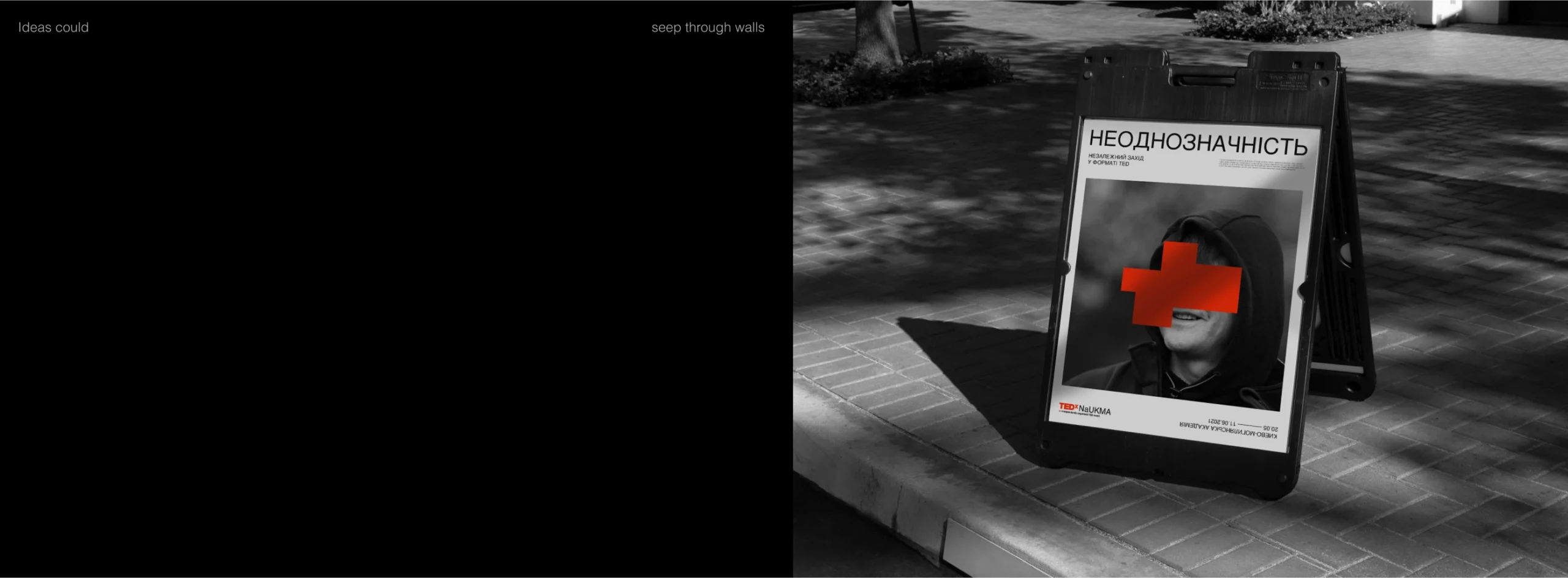 Ми почали шукати форму абстракції та знайшли рішення на фасадах. У формах які подарувал нам феномен graffiti removal. Нам сподобалось, що написане все ще можна розгледіти під рясними шарами фарби. Таким чином by hiding, we could create new meanings стало ключовою концепцією айдентики. Що рифмується зі слоганом TED “ideas worth spreading”.