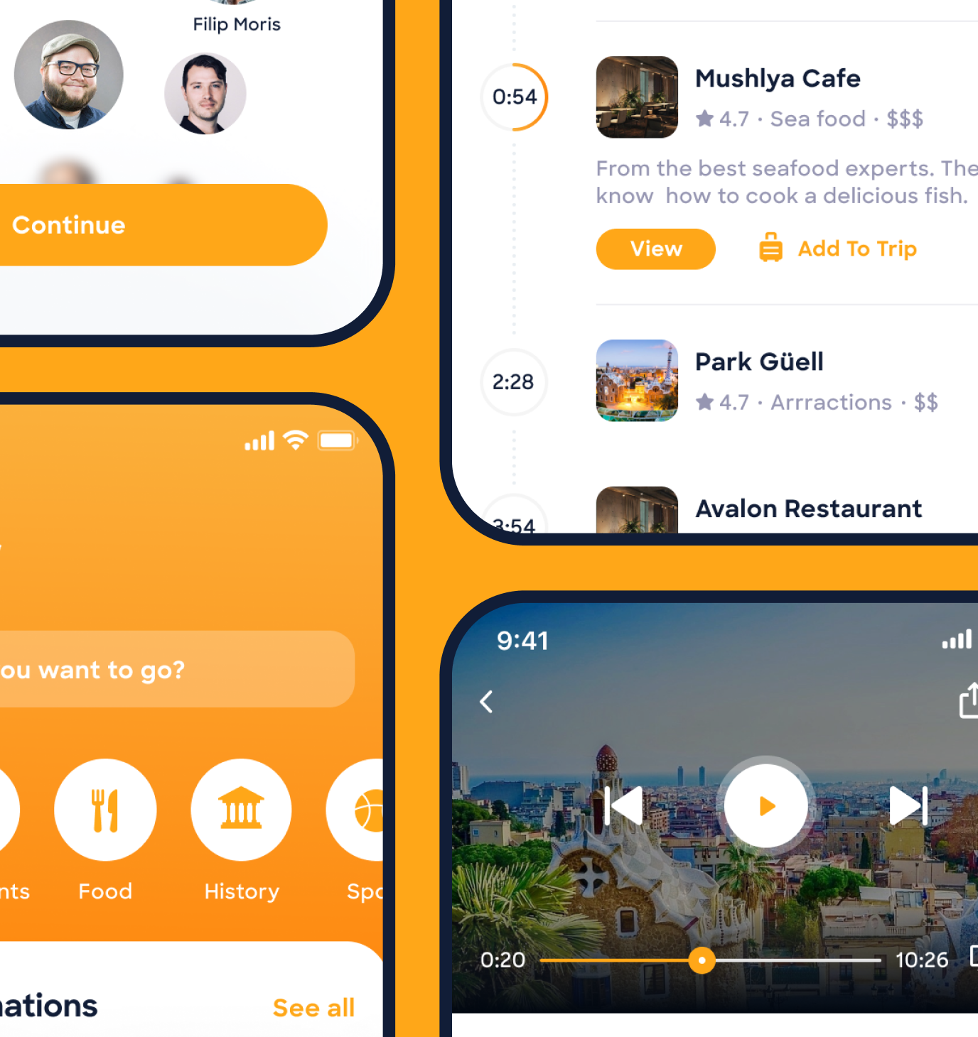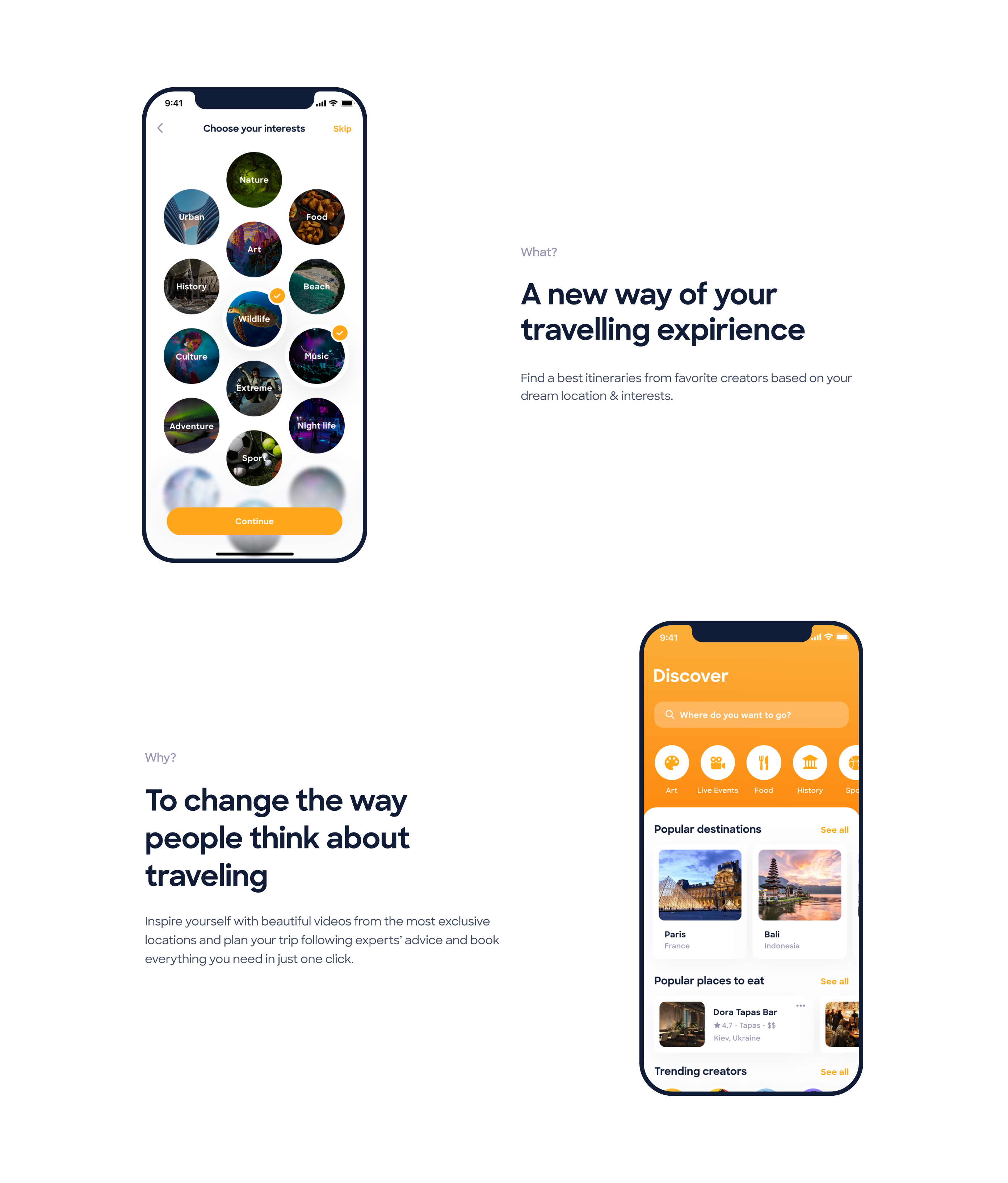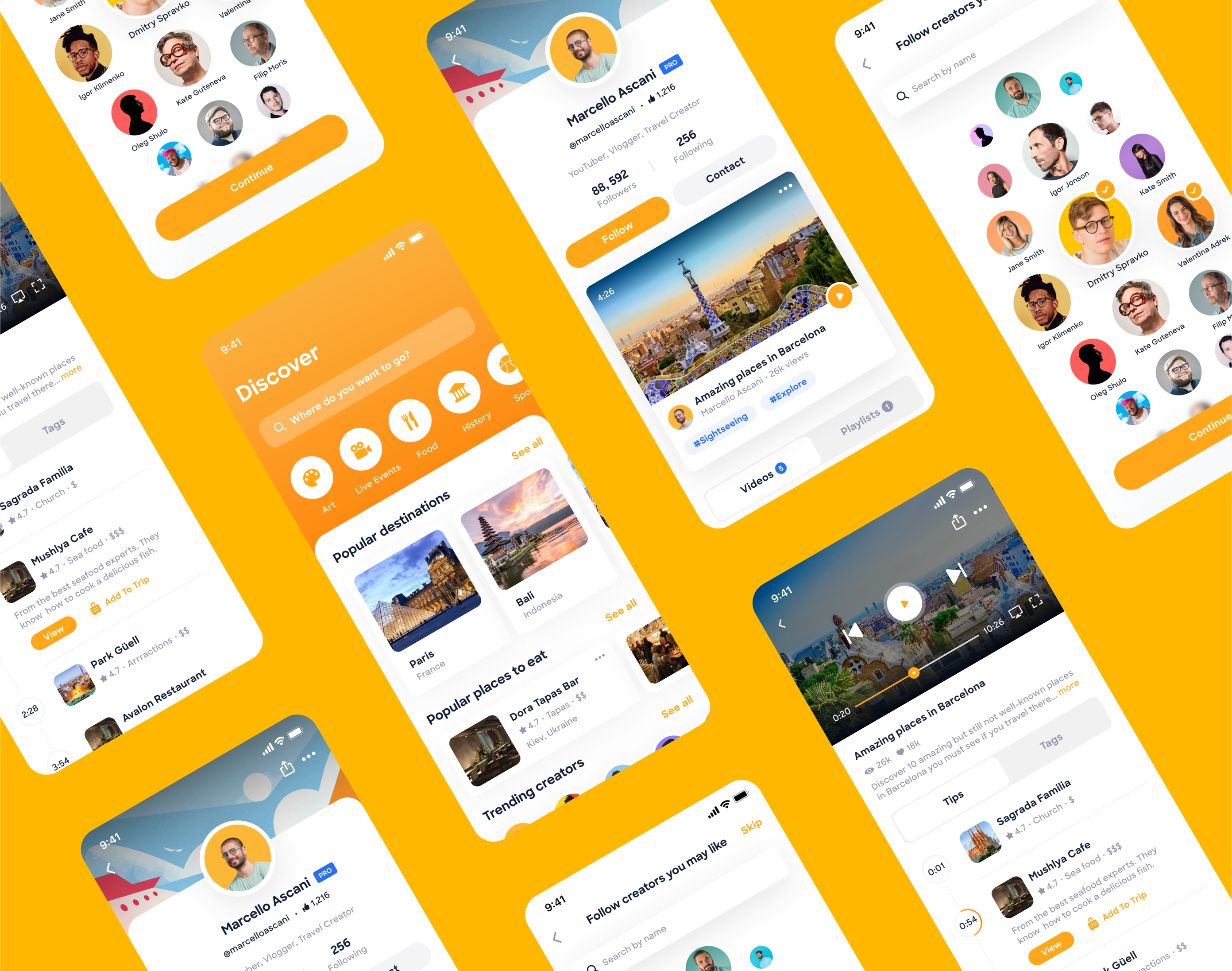 We aimed to embody the startup’s vibrant idea of connecting travel vloggers with voyagers and travel businesses by designing a mobile application and its brand style.