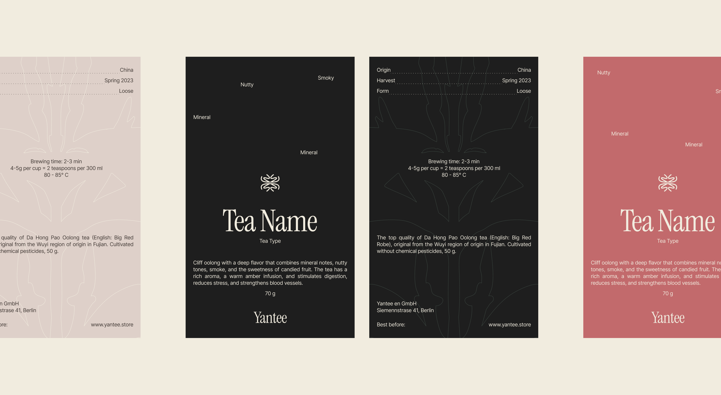 The color palette serves both present and future collections: earthy, plant-based tones for the current tea lineup, complemented by distinctive hues for unique and experimental teas yet to come.